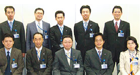各部署から集結したITプロジェクトチーム。前列左からITコンサルティング部 岡課長、同部 伊藤次長、総務部 橋爪副部長、業革推進部 安里次長、決算課 森田課長代理、ITコンサルティング部 浅海チームリーダー、税務部 佐々木次長、ISOコンサルティング部 白石副部長、井上取締役、第1財務指導部 3部 田村副部長