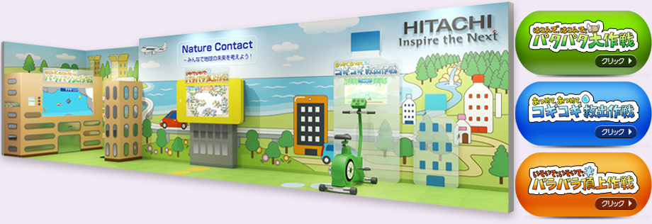 日立ブース「Nature Contact」では、物流・情報(じょうほう)・水をテーマに、体を動かして遊ぶ3つのゲームがあります。私(わたし)たちの暮(く)らしを支(ささ)える技術(ぎじゅつ)やしくみ、環境(かんきょう)について、楽しく遊びながら学べます! なつやすみにお友だちやおうちの人と、ぜひ足を運んでみてください。