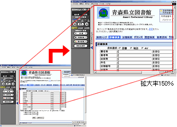 | 表示サイズ変更機能 | 閲覧しているホームページの表示を利用者の見やすい大きさに変更することができます。同種の拡大ツールでは、文字しかサイズ変更できないことが多いため、画面のサイズを変更するとレイアウトが崩れてしまうことがあります。しかし、本製品では、画像も含むサイズ変更が可能なため、画面デザインを崩さないまま50%〜300%まで好みのサイズで拡大・縮小することができます。 |