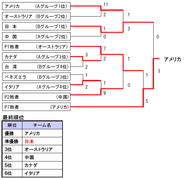◎決勝の相手は敗者復活で勝ち上がってきたアメリカ。3連投の上野が5回を 抑えるが、打線も1安打に抑え込まれたまま終盤へ。 ◎力投の上野であるが、6回表、セーフティバントを決められランナーを背負 い、続く3番にライトに2ランを運ばれて2点を失う。続く4番にもレフト スタンドに運ばれてこの回、3点を失う。 ◎打線は相手エースを攻略できず1安打完封負け。36年ぶりの優勝はならなか ったものの、最低限の目標であった北京五輪出場権の獲得、さらに決勝でも 厳しいアウェー状態で戦い、敗れはしたもののシドニー五輪の銅メダルより 一つ上に進歩した全日本の健闘を心から称えたい。 |