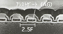 日立製作所 半導体グループ(グループ長&CEO長谷川 邦夫)は、このたび、同中央研究所および同デバイス開発センタと共同で、ギガバイト時代のフラッシュメモリ用に多値(注1)で高速書込みを実現する次世代AND型フラッシュメモリセル「AG-AND(Assist Gate-AND)」を開発しました。 本セルは、セル構造にセル間の干渉を防ぐアシストゲート(Assist Gate)を採用した独自開発のフィールドアイソレーション(Field Isolation)方式を、書込み方式にホットエレクトロン方式(注2)を採用する事により、多値のメモリセル構成でも高速書込みが可能となり、0.13μmプロセスにおいて10Mバイト/秒の書込みを実現できます。 また、さらなる小チップサイズ化も実現でき、大容量データを小型のフラッシュメモリやフラッシュカードに高速で記録することが可能になります。このため、今後映画等の大容量デジタルコンテンツをブロードバンドで受信する際のダウンロード時間を大幅に短縮できます。 <背景> AND型フラッシュメモリのようなファイル・ストレージ用フラッシュメモリは、デジタルスチルカメラ、ポータブル音楽プレーヤのみならずデジタルビデオカメラや携帯電話、PDA等の各種携帯機器、情報機器に大容量ストレージROM/カードとして普及しています。また、小容量HDDの置き換えとして産業・通信用途にも需要が伸びています。こうしたなか、さらなる大容量かつ小型化、低価格化を実現するためにはプロセスの微細化に加え、メモリセルの多値化によるチップサイズの小型化が最大のキーポイントとなっています。 一方、多値化されたメモリセルの書込み時間は、2値のセルに比べて遅いと言う問題点がありました。200万から300万画素程度のデジタルカメラでは、現在の1Mバイト/秒程度の書込み時間で十分であったものが、更なる高画素化やブロードバンドを使った各種デジタルコンテンツ配信の際には10Mバイト/秒程度の高速書込みが必要となります。 このような小型化かつ高速化の要求に対応するため、当社は「多値で高速な」フラッシュメモリを実現する「AG-AND」型フラッシュメモリセルを開発しました。 <技術の詳細> 本「AG-AND」型フラッシュメモリセルの構造は、セル間の干渉を防ぐアシストゲートと、フローティングゲートを交互に組合せた当社独自のフィールドアイソレーション方式を採用しています。溝をつくってセルを独立させる従来の浅溝アイソレーション方式(SGI:Shallow Groove Isolation)に比べ、セル面積の小型化が実現できます。 また、高速化のために書込み方式を従来のF-Nトンネル方式(注3)からホットエレクトロン方式に変更しています。ホットエレクトロンをソース側から注入することでフローティングゲートへの注入効率を上げ、高速化かつ並列書込みが可能となりました。 このため0.13μmプロセス品の製品化にあたっては、チップ内を4バンク構成とすることで高速10Mバイト/秒を実現できます。 本セルの特長は次の通りです。 1. 高速書込みの実現 書込み方式に高速化かつ並列書込みが可能なホットエレクトロン方式の採用により「多値で高速な」フラッシュメモリを実現しています。0.13μmプロセス品の製品化にあたってはチップ内を4バンク構成とすることで高速10Mバイト/秒を実現でき、通常の音楽CD1枚(圧縮技術を用い64Mバイト程度の容量)が約6秒でフラッシュカードにダウンロード可能となります。 マルチメディアカード(注4)などの小型フラッシュカードが当面の目標としている10Mバイト/秒の書込みを実現したフラッシュメモリ1チップないし2チップを搭載した小型カードを市場に提供可能となります。 2.セルの小型化を実現 プロセスの微細化のみならず小セルサイズを実現するために、今回の「AG-AND」型ではセル構造を当社独自のフィールドアイソレーション方式に変更しました。0.13μmプロセス時にセル面積0.052μm2(1ビット換算)を実現、現在の浅溝アイソレーション方式での0.18μmプロセス品に比べ1/2以下に小型化が可能となります。 今後は今回の技術を使ってギガビットクラスのフラッシュメモリおよびそれを使った各種フラッシュカードやシステムを製品化する予定です。 なお、本成果は12月3日から米国ワシントンD.C.で開催される電子デバイスに関する国際会議「2001 International Electron Devices Meeting」にて発表します。 <用語説明>