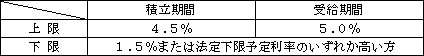 積立額ならびに年金額の計算に用いる指標利率は、10年国債応募者利回りの過去1年平均を使用します。指標利率の上下限は、下表の通りとしています。積立期間中、年金受給期間中とも、適用する利率は毎年見直しを行うこととし、経済変動に対してより柔軟に対応できる制度としました。