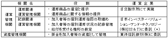 5. 運営体制 法に定められた運営管理機関・資産管理機関については以下の体制を予定しています。 ![]() *同社の運営管理機関登録を待って実施。 6. 運用商品