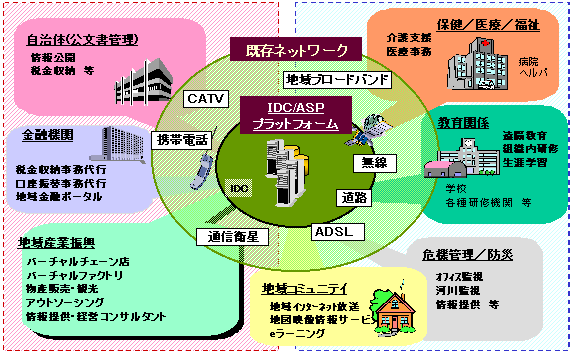 「知識創発型ネットコミュニティ研究フォーラム」を立上げ 日本インターネットデータセンタ(社長 岩下安男、以下JIDC)、NTTデータ、日立製作所、三菱電機および日本電気の5社は、地域社会向けIDCソリューションを企画・提案・事業化する共同プロジェクトをJIDC内に立ち上げることで9月26日に合意しました。 政府のe−Japan戦略のもと、電子政府・電子自治体の実現に向けた取組が進められている一方で、地域住民や地域企業などといった地域社会に、より密接に関連したIT化などについては、今後、伸びていく分野として注目されています。具体的には、e−ラーニング、地域コミュニティのポータルサイトや物販・物流・決済・CRMの連携などを促進するような地域社会活性化に向けた取組です。このような取組が実現すると、地域社会のもつ知識や知恵を共有しあったり、あるいは相互に刺激し合い、新たな知を創りだすような社会づくりができる、すなわちe−Japan戦略における「知識創発型の社会」の実現が可能になると考えます。 JIDCは、この知識創発型社会を実現するための基盤となるのが、地域社会IDCというコンセプトであると考えます。地域社会IDCとはインターネットなどの情報ネットワークを基盤として、地域社会に住む市民や地域企業および公的機関を含め、その地域社会に関わる人々の知識や知恵を共有しあったり、相互に刺激を与え合うことができるというコンセプトです。 このようなコンセプトを実現するために必要なIDCソリューションを企画・提案・事業化するため、IDC事業に関するノウハウを持つJIDCとソリューション開発にノウハウを持つ4社が共同でプロジェクトを立上げました。この共同プロジェクトでは、「知識創発型ネットコミュニティ研究フォーラム」を設立し、地域社会IDC実現に向けての検討を進めていきます。具体的には、地域社会をネットワーク化する際の課題として、以下4点をテーマとして取り上げる予定です。