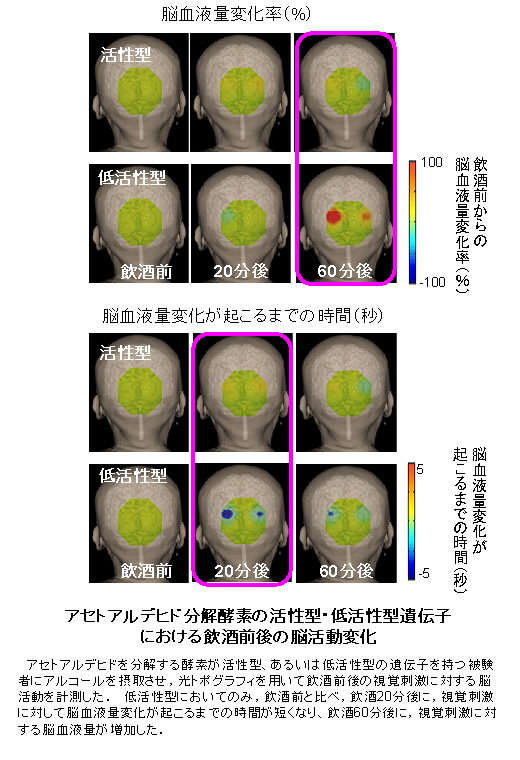 この結果から、一般にアルコールに弱いといわれている低活性型の遺伝子を持つ人は、体内でアセトアルデヒド濃度が上昇することで、脳機能および生体に影響を受けていると考えられます。