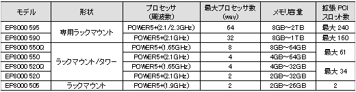 同時に、1Uサイズのエントリーモデル「EP8000 505」において、新たにPOWER5+搭載モデルを追加したほか、エントリーモデル「EP8000 550Q」「EP8000 550」「EP8000 520Q」「EP8000 520」にプロセッサ動作周波数を向上したエンハンスモデルを追加しました。