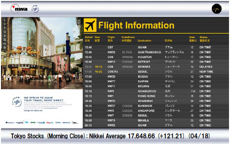 株式会社日立製作所(執行役社長:古川 一夫/以下、日立)は、最新のフライト情報や動画ニュース、航空会社からのお知らせなど、複数の情報を1つの画面内に分割表示できるインフォメーションディスプレイシステムを、ノースウエスト航空(以下、NWA)の協力のもと開発し、4月22日に、NWAが成田国際空港内にグランドオープンする「ワールドクラブ®」ラウンジに納入します。本システムは、NWAだけではなく、提携航空会社の乗客も利用するラウンジの特性に対応し、提携航空会社を含めたフライト情報を表示するなど、お客様へのきめ細やかな情報提供サービスを実現します。また、従来NWAのスタッフが日本語と英語で行っていた、ラウンジ内への搭乗案内をはじめとするフライト情報のアナウンスについて、専用のタッチパネル方式端末による簡単な操作で、自動音声による放送ができるなど、スタッフの業務効率化に貢献します。