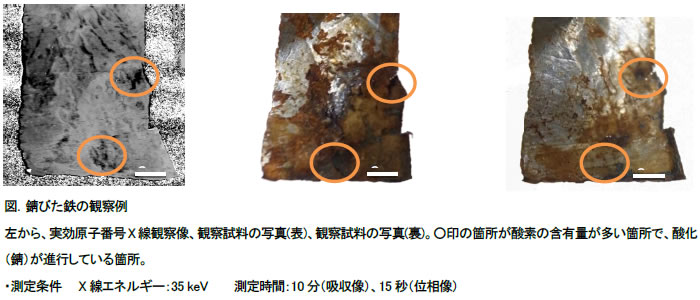 開発した技術で錆びた鉄を測定したところ、酸化により錆が進行している部分では実効原子番号が小さくなっていることを検証しました。これは、酸化により元素番号の小さい酸素(元素番号8)の割合が、鉄(元素番号26)に比べて増加したことによるものであり、この検証により本イメージング法では酸化など元素組成の変化も簡便に可視化できることが確認できました。