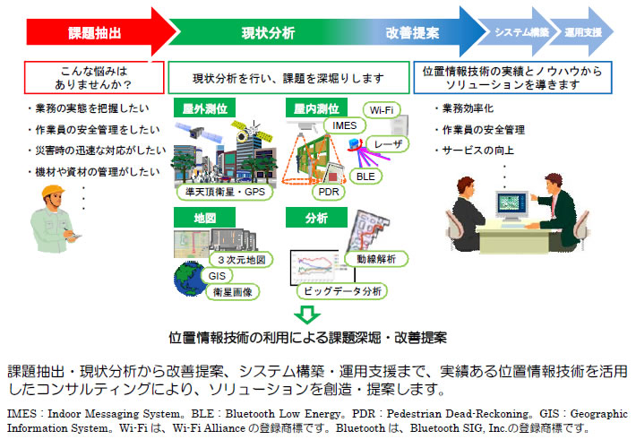 そのような背景の中、日立はGPS・準天頂衛星などの衛星測位活用技術、IMES*2や無線LANなどを用いた屋内測位技術、GIS*3や衛星画像を活用した地図関連技術、そしてそれらに関するビッグデータの分析技術など、屋内・屋外での位置情報の利活用を推進してきました。例えば、関連機関と連携した商業施設や鉄道施設、物流倉庫、工事現場など屋内・屋外における実証実験では、利用者の動線の分析や設置物のレイアウトの最適化などを実施しています。また、博物館での実証実験を一般財団法人 衛星測位利用推進センター(理事長:岡部篤行)などと共同で実施し、多くの実績とノウハウを蓄積しています。本サービスでは、顧客の課題を抽出するとともに現状分析による課題を発見することで、位置情報を活用した業務改善およびシステム導入の提案を行います。