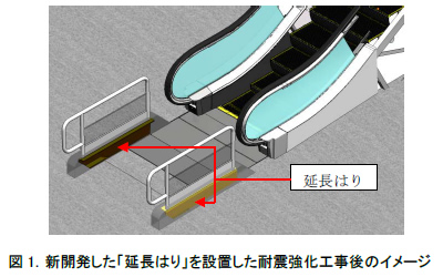 既設エスカレーターに対して延長はりを設けることで、建物に追加はりを設置することなく耐震強化を図ることが可能となる耐震強化構造を開発しました。