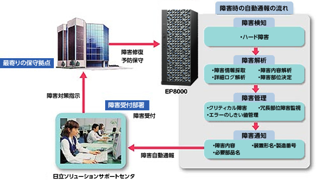 お客さまシステムのEP8000シリーズ上で、ASSISTのエージェントソフトウェアがハードウェアの状態を常に監視しています。ハードウェアに障害が発生した場合は、直ちに障害情報が日立ソリューションサポートセンタに通報され、この障害通知に基づき保守員と部品を手配し、迅速な障害対応を行います。