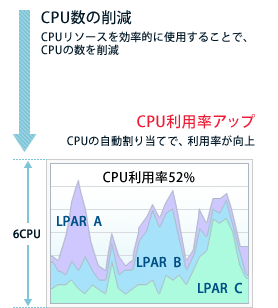 CPUリソースプールから自動でCPUがパーティションに割り当てられるため、CPUリソースを効率的に使用可能。仮想化機能を使用しない場合よりもCPU数を抑えることができる。