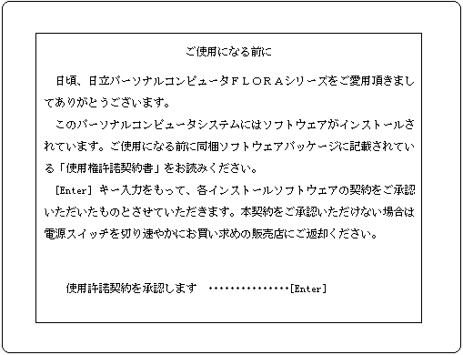 FLORAシリーズのプレインストールモデルの一部の機種、モデルでは最初に電源を投入してHDD(プレインストール状態)からシステムを起動すると「ご使用になる前に」の使用権許諾に関するメッセージが表示されます。2回目以降は表示されません。