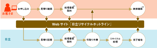 リサイクル処理の進捗確認・完了報告については、Web サイト「日立リサイクルホットライン」からいつでもご確認いただけます。 |