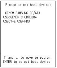 1 セキュリティPCの電源を入れ、セキュリティPCの立ち上げ中に画面中央に 「HITACHI」と表示されたら、[F12]キーを押す。[Please select boot device]画面が表示される。![]()