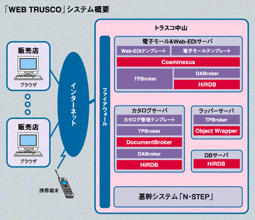 「お客様指向」の発想から生まれたWeb受注システムは、名付けて「WEB TRUSCO」。基幹システムの情報をいかにスムーズにWeb環境へつないでいくかが、システム構築の最大の課題であった。基幹システムと連携しリアルタイム処理を実現しないと、他のシステムとデータの同期をとるのがむずかしいということだ。「午前の注文は午後に届ける」のがトラスコ中山のビジネススタイルである。基幹システムからデータの一部をインターネット公開用サーバへファイル転送し、夜間バッチでデータの整合性をとるという方法では、トラスコ中山のビジネスのスピードをキャッチアップできない。