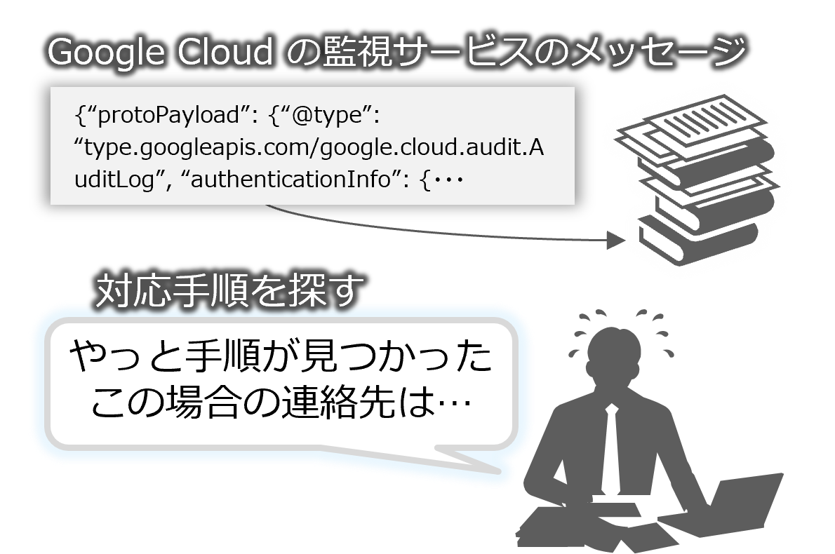 監視オペレーターは Google Cloud の監視サービスで複数のシステムを監視し、大量のメッセージに対処することでシステムの安定稼働を維持します。監視対象が基幹システムや重要なサービスに直結する業務システムであれば、100パーセントに近い稼働率が求められます。システム停止を回避するには、重大障害につながる予兆となるメッセージを見逃さないようにしなければなりません。