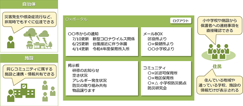 掲示板、回覧、電話、メールなど、自治体や施設から住民へのさまざまな情報伝達手段を、Webポータルに集約し、情報伝達を効率化します。住民はWebポータルを見るだけで、いつでも最新の情報を確認できるようになります。