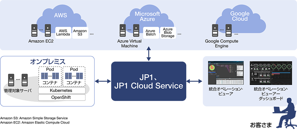 JP1でクラウド環境、オンプレミス環境やコンテナ環境を統合的に管理する場合のシステム構成は、次のようになります。