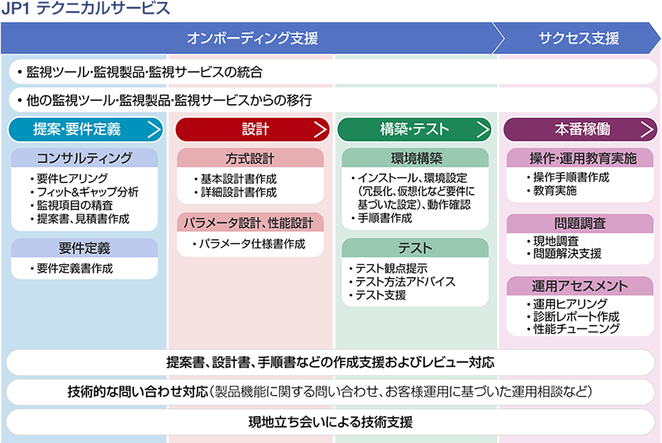 最後は、ツール提供元ベンダーのサポートについて。導入前のアセスメント、導入時の連携・構築支援はもちろん、運用開始後の定着化支援、技術的サポートの提供内容によって、継続的に安定した統合監視を実現できるかどうかが決まります。支援、サポートの提供方法や体制は、メールや電話などによる問い合わせ対応、定例ミーティングの場を設けての支援など、ベンダーによって大きく異なります。無償と有償の範囲も含めて、自社のリソースやITリテラシーに合わせた最適な支援、サポートが提供してもらえるか、しっかり確認しておきましょう。