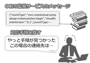 監視オペレーターはOCIの監視サービスで複数のシステムを監視し、大量のメッセージに対処することでシステムの安定稼働を維持します。監視対象が基幹システムや重要なサービスに直結する業務システムであれば、100パーセントに近い稼働率が求められます。システム停止を回避するには、重大障害につながる予兆となるメッセージを見逃さないようにしなければなりません。