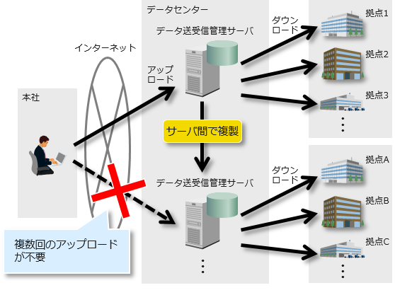 複数のデータ送受信管理サーバを使用してファイル転送する運用では、1台のサーバにアップロードしたファイルを、他のサーバに複製することができます。同じファイルを多くの宛先に送る場合でもアップロードは1回で済むため、業務の効率化が図れます。