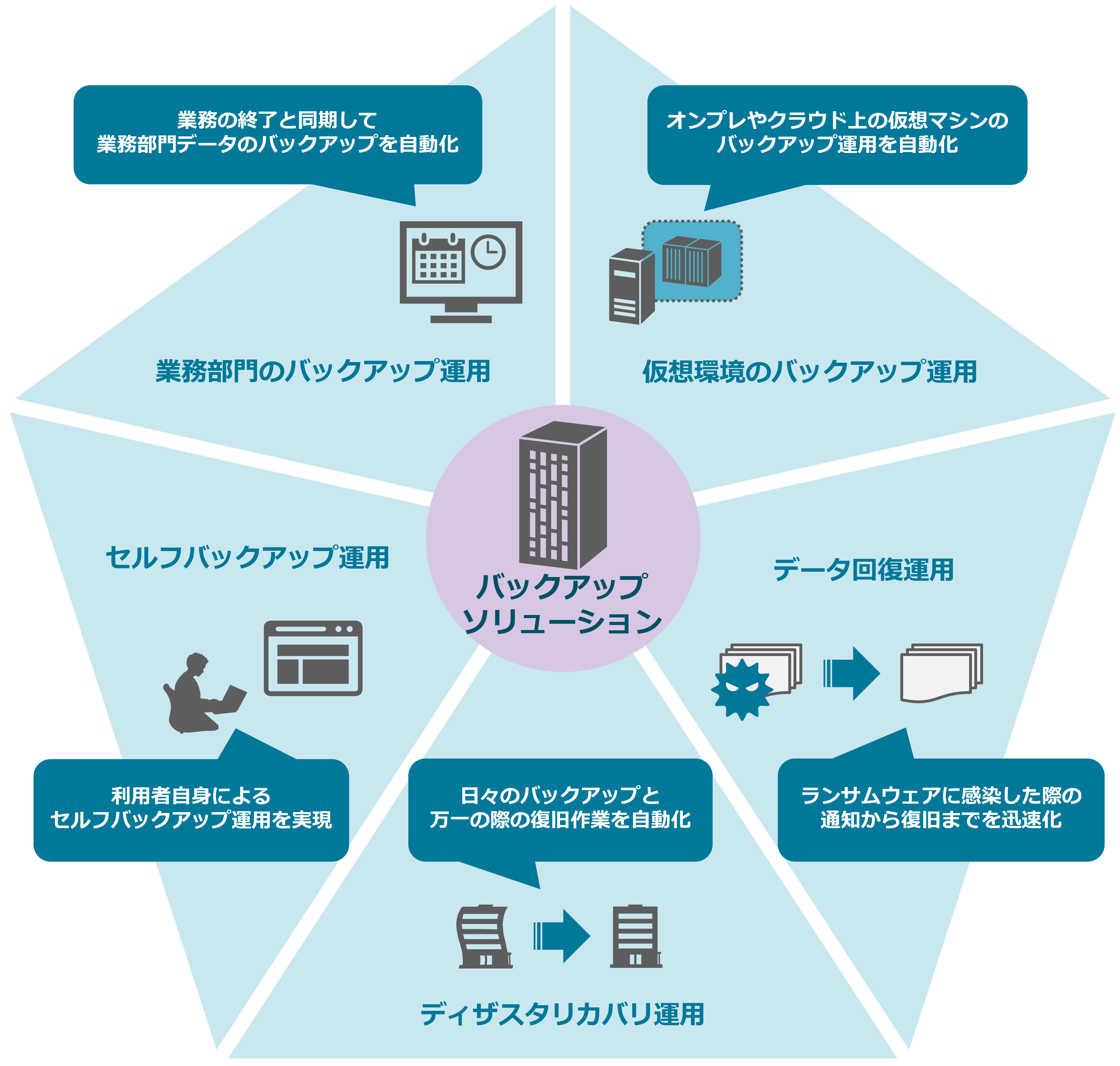 このソリューションでは、日々のバックアップデータの取得や世代管理、万一の際のデータ保護やデータ復旧を自動化することで、バックアップ運用の効率化と事業の継続を支援します。