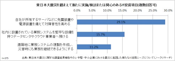 これは前回取り上げたものとほぼ同様のデータだが、年商500億円未満の中堅・中小企業に対して、「東日本大震災を踏まえて新たに実施/検討または関心のあるIT投資項目」を尋ねた結果の一部である。
