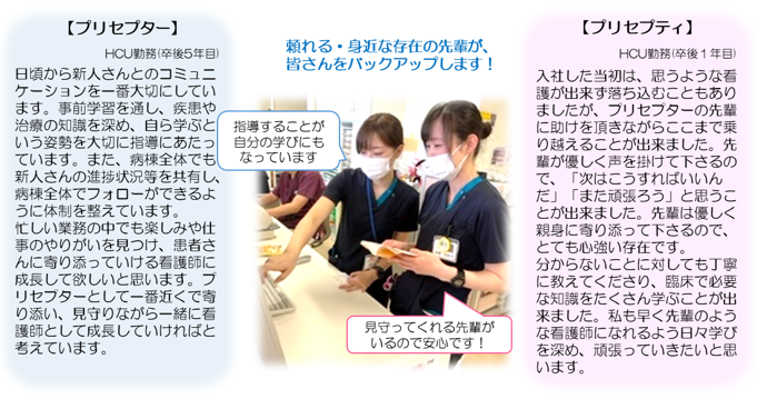 新入職看護師教育にはプリセプター制度を採用しています。プリセプター制度とは、プリセプター(先輩看護師)がプリセプティ(新入職看護師)をマンツーマンで 教育・指導すること