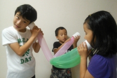 2つの風船をねじってつなげると、4人で会話をすることができます。