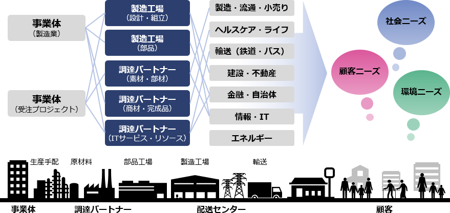 「素材・部材」「商材・完成品」「ITサービス・リソース」など、バリューチェーン全体にかかわる調達パートナーの皆さまとの価値創造が重要であると考えています。このため、ビジネスプロセスや製品サービスの開発における企画構想段階(営業活動や商品企画など段階)から要素技術の共同開発を行い、先端技術の採用に取り組みます。環境負荷低減、素材のリサイクル、材料使用量の削減などの視点でも、調達パートナーの皆さまとともに、共同VEC活動に取り組みます。