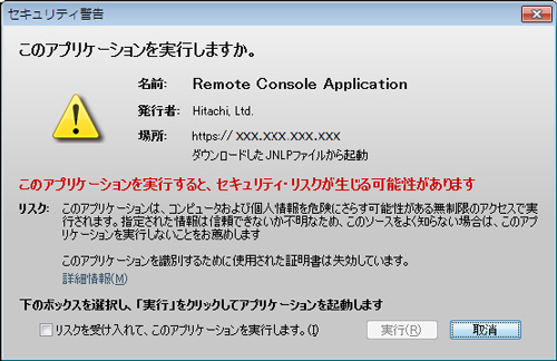 - リモートコンソールアプリケーションを起動し、証明書失効のダイアログにて「リスクを受け入れて、このアプリケーションを実行します(I)」をチェックし、「実行」を選択してください。
