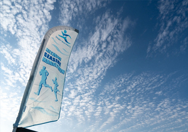 創業の地におけるブランディングキャンペーンで掲載中の「相賀町ロードサイン」をランナーが通過