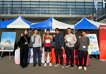 日立製作所は、発着点の市民運動公園に企業ブースを設置し、タオルやトートバックなどのノベルティを配布しながらランナーたちの到着を待ちました。