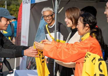高橋尚子さん、猫ひろしさん、マラソンYouTuberのこわだ君さん、まかランさんがゲストランナーとして参加。ハイタッチや伴走、掛け声で市民ランナーを鼓舞し、沿道の応援にも笑顔で応えるなど、大会全体を明るく盛り上げました。街頭では「創業の地 日立市でのブランディングキャンペーン」で掲載しているロードサインがランナーたちを見守ります。日立市ならではの景観を楽しめるコースを3,975名が見事に完走しました。
