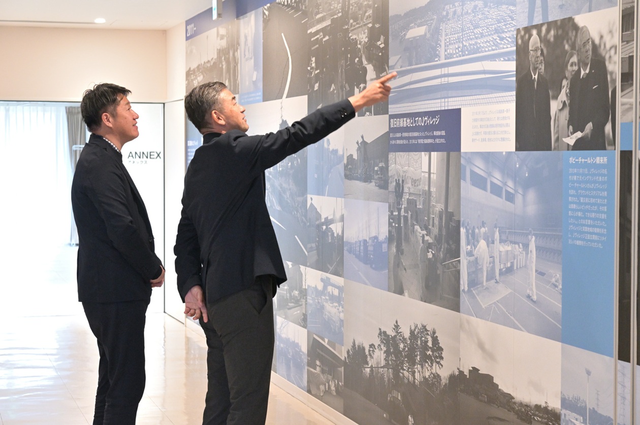 こちらも約10年ぶりの再訪となる。「事故後の福島第一原子力発電所に取材で入る際には、こちらで防護服に着替えて全面マスクをつけて、バスに30分以上揺られながら向かっていました。当時の記憶が蘇ります」と話す松井氏。Jヴィレッジ企画総務グループ長の明石 重周さんの案内で、Jヴィレッジの歩みを約60メートルに渡る壁面に描いた「J-VILLAGE STREET」を見て回り、震災当時を振り返った。