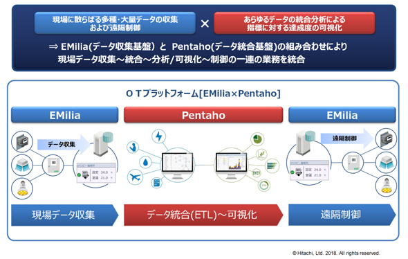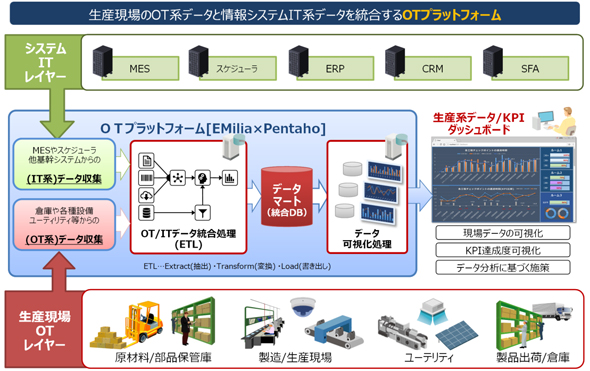 日立製作所が提案するOTプラットフォームは、現場に散らばるさまざまなデータの収集と設備などの遠隔制御を実現するデータ収集基盤「EMilia(エミリア)」に、各種データの統合分析と可視化を実現するデータ統合基盤「Pentaho(ペンタホ)」を組み合わせた構成となる。このOTプラットフォームが製造現場のOTレイヤーと、オフィスのITレイヤーとの“橋渡し役”となり、OT/IT双方のデータ収集、データ統合処理、データマート(統合DB)作成、データ可視化処理を全て一元的に行ってくれる。そして、その結果を生産系データ/KPI(重要業績評価指標)ダッシュボードとして、経営層および工場幹部層、工程担当者、設備・保守担当者向けに提示するといったこともでき、あらゆる立場のスタッフと様々な切り口のKPIを共有することができる。