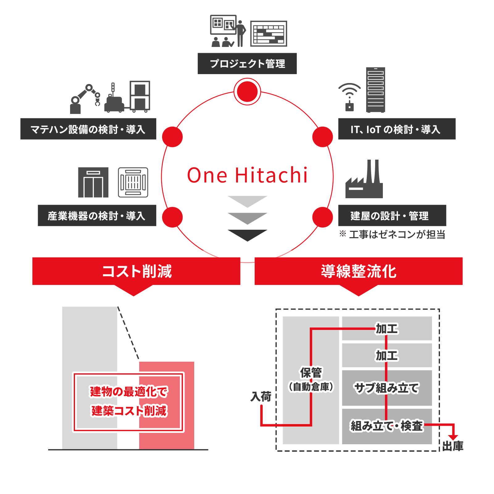 IT×OT×プロダクト全てにおいて実績・ノウハウを持つ日立が、実現力ある構内物流構想を策定します。