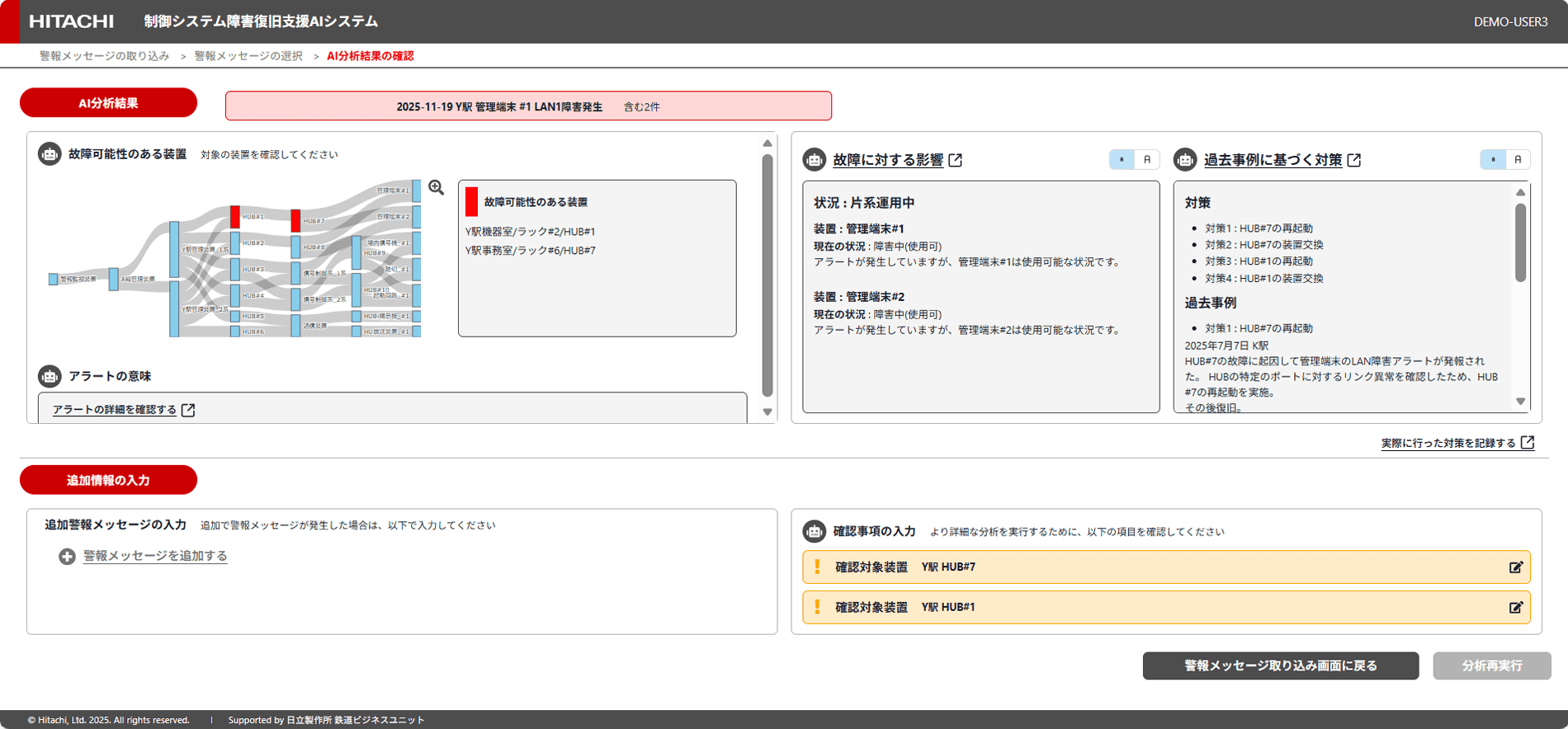 - AIエージェントの画面に「故障可能性のある装置」「故障に対する影響」「過去事例に基づく対策」など、AI分析の結果が表示される