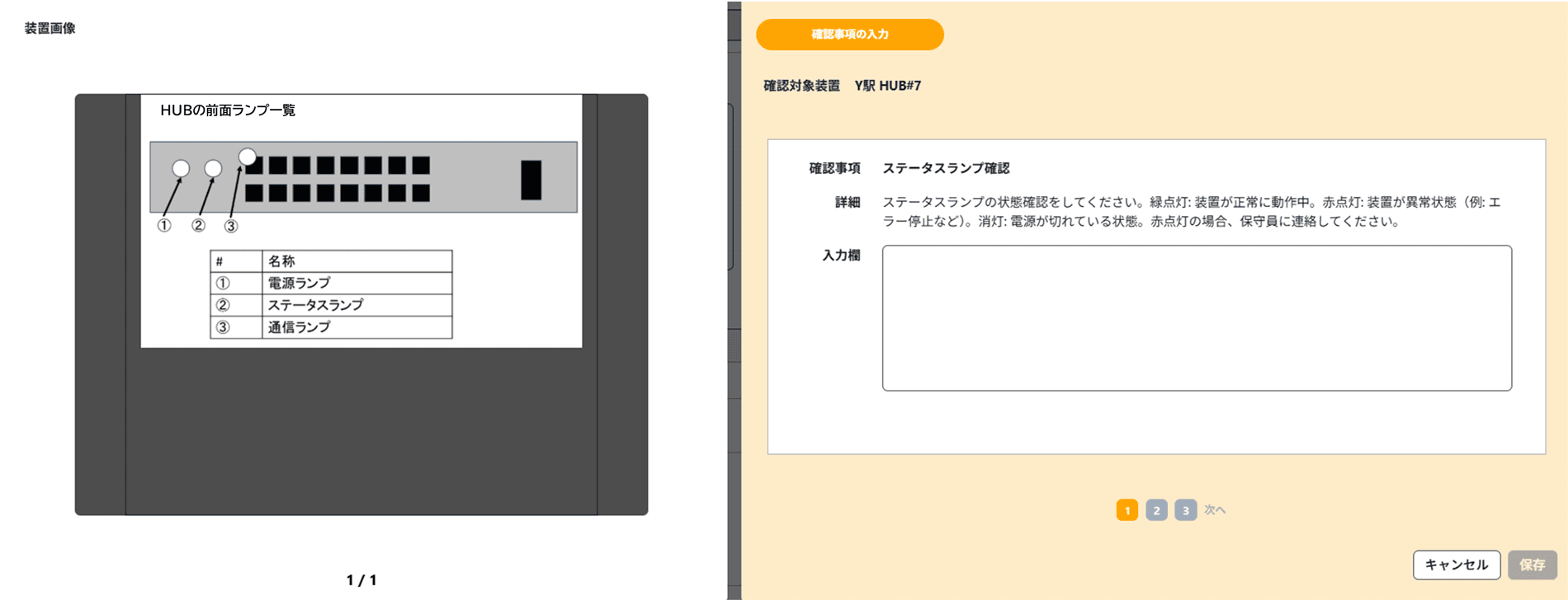 - さらに、「確認事項の入力」より、装置のマニュアル画像および確認が必要な内容が表示され、復旧に向けた操作手順が案内される