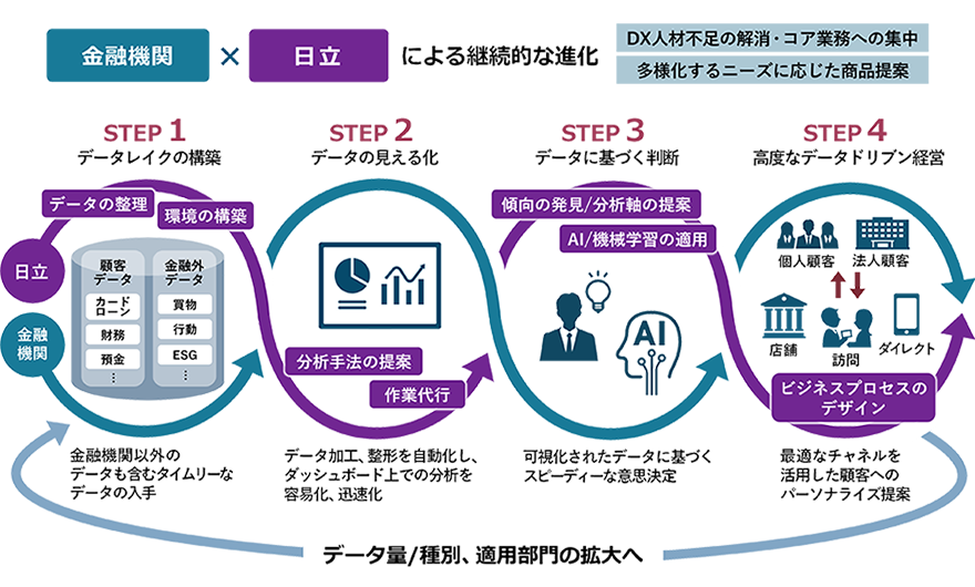 日立では実案件で得た知見・ノウハウに基づく伴走型人的支援により、金融機関ごとに有効なデータ分析を確立するためのPDCAサイクルを強力にサポート。データを常に効果的に利活用できるプラットフォームの構築を支援し、複雑化・多様化する金融機関のニーズに応えます。