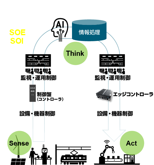 近年のIoT化の進展で、ITシステムの利用価値がSORからSOE/SOIへシフト。個別最適化からより広い範囲での全体最適化で仮説立案や改善提案が可能となった。OT領域で物理現象をセンシングによりデータ化し、収集したデータをIT領域で分析、結果をフィードバックするSense-Think-Actのデータ分析ループで情報制御システムの運用最適化を実現してきた。