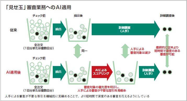 ![「見せ玉」審査業務へのAI適用:[従来のフロー]チェック前の全注文(1日分または複数日分)→抽出→抽出後の詳細調査(人手)。[AI適用後のフロー]チェック前の全注文(1日分または複数日分)→抽出(※ここまでは従来と同一)→抽出後のデータをAIによりスコアリング(審査対象の優先度を明示し、人手による審査が不要な取引を見極め)→AIによるスコアリング後のデータを詳細調査(人手)。※人手による審査対象は減少。詳細調査後は最終的に従来より短時間で深度のある審査が可能に。[AI適用のメリット]人手による審査が不要な取引を機械的に見極めることで、より短時間で深度のある審査を行えるようにしている。](images/1812-kabu-dot-com-pic01.png)