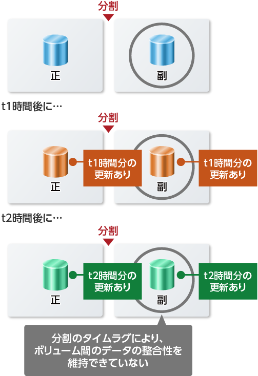 各ボリュームをバックアップするために副ボリュームにコピーした後、各コピーペアを分割するタイミングにばらつきが出ると、ボリューム間のデータの整合性を維持できず、バックアップデータとして使えなくなります。