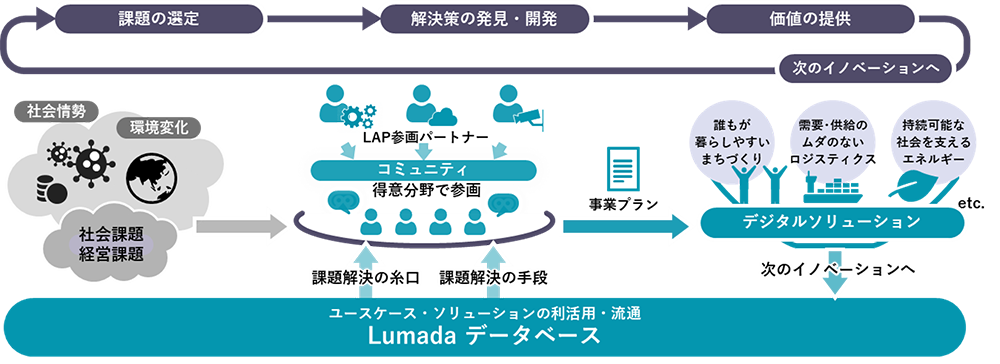 ここでパートナー同士の多様な知見、ノウハウを組み合わせ、新たなソリューションを生み出していきます。生まれた価値をLumadaデータベースに登録することで、それらがさらに活用され、また新たな価値を生み出していく。この価値創出の連鎖によって、継続的にイノベーションを実現していきます。