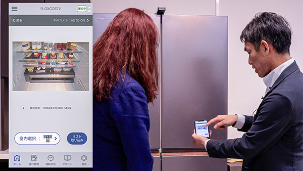 - そこで、この「冷蔵庫カメラ」。冷蔵室を開けると自動で撮影して、スマートフォンに写真を送りますので、常に冷蔵室の在庫を把握できます。