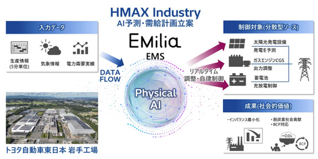 日立、フィジカルAIで電力需給を予測・最適化・自動制御するHMAX IndustryのEMS「EMilia」を、自動車工場向けにトヨタ自動車東日本と共同で機能拡張し、納入