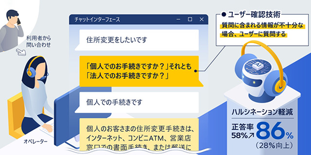 問い合わせ内容が不十分な場合でも、自動的に必要な情報を確認する質問を行う日立独自の「ユーザー確認技術」により、回答精度が28%向上することを検証しました。