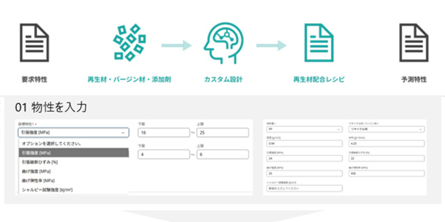マテリアルズ・インフォマティクス(MI)を用いた再生材の品質解析・配合比率の提案機能を開発し、これらの機能の有効性をともに実証し、再生プラスチックの活用における課題解決と活用拡大をめざします。