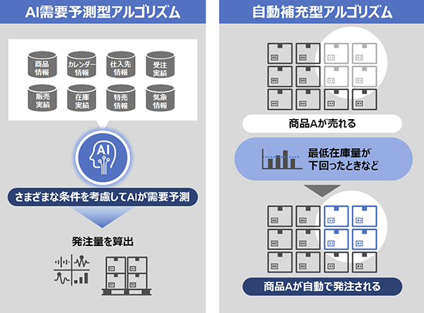 「需要予測型自動発注サービス」には、AI需要予測型アルゴリズムと自動補充型アルゴリズムがあります。AI需要予測型アルゴリズムは取り扱う商品の特性などの条件を考慮して、需要を予測し、発注量を算出。自動補充型アルゴリズムは、販売頻度や在庫数でしきい値を設定し、その値を超えた場合に商品を自動で発注します。